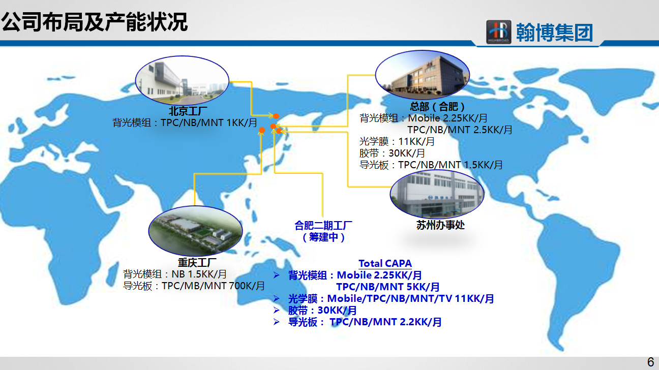 翰博集團始創(chuàng )于2005年9月,是國內光電顯示行業(yè)第一家集顯示設計、光學(xué)開(kāi)發(fā)、智能制造、供應鏈整合于一身的系統方案供應商,是國內最大的液晶顯示面板企業(yè)京東方在顯示類(lèi)材料中的戰略合作伙伴,其業(yè)務(wù)范圍覆蓋北京、合肥、蘇州、香港、重慶等地。集團研發(fā)設計的背光模組、偏光片等產(chǎn)品,廣泛應用于數字電視、液晶顯示器、筆記本電腦、平板電腦、智能手機、車(chē)載顯示等液晶顯示產(chǎn)品。集團自從2014年起進(jìn)入快速發(fā)展期,實(shí)現了逐年跨越式發(fā)展,當前集團公司擁有員工總數6000余人。2015年11月份,翰博集團正式在新三板掛牌上市。成為國內光電顯示行業(yè)第一家以背光模組為主營(yíng)業(yè)務(wù)的新三板掛牌企業(yè)。